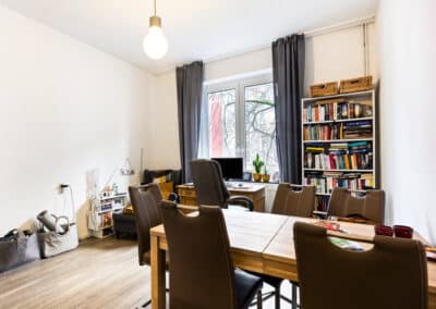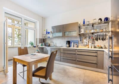 Das angebotene Mehrfamilienhaus bietet vier Wohneinheiten, drei Wohnungen sind langjährig vermietet, die Dachgeschosswohnung steht derzeit leer. Die Wohnungen verfügen über klassische Grundrisse: Zwei Wohnräume zur Straßenseite, ein Schlafzimmer mit angrenzendem Bad im hinteren Bereich sowie eine großzügige Wohnküche, teils mit Balkon oder Wintergarten zur Gartenseite in Südausrichtung. Der kleine Stadtgarten ist einer Mietpartei zugeordnet. Der Altbaucharme ist in vielen Bereichen erlebbar, was den besonderen Charakter des Hauses unterstreicht. Das Treppenhaus besitzt noch ein großes Oberlicht und ist in seinem Ursprungszustand sehr gut erhalten. Kassettentüren und auch Dielenböden sind teilweise vorhanden.