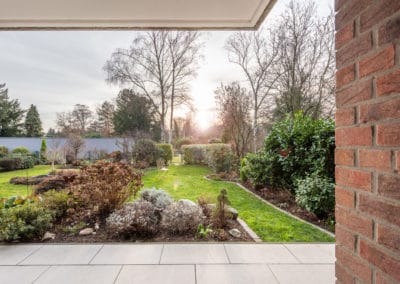 Die Außenbereiche gliedern sich in drei ganz unterschiedliche Zonen mit viel Privatsphäre: Der Gartenbereich mit unverbautem Fernblick, die geschützte uneinsehbare Sonnenterrasse und die repräsentative hofartige Eingangszone. Eine Doppelgarage, die auch modernen Anforderungen gerecht wird, rundet die Nutzungsmöglichkeiten ab.